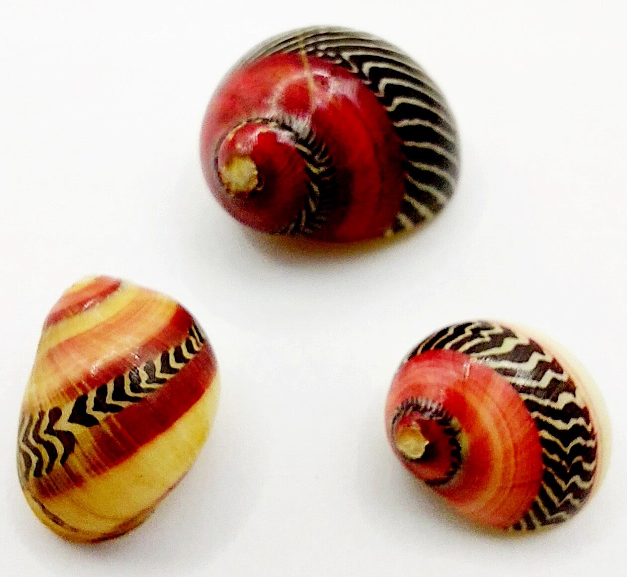 Diese bunten wunderschönen Häuschen sind zwischen 1,3 und 2,5 cm groß. Jedes Schneckenhaus hat ein individuelles Muster.