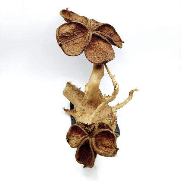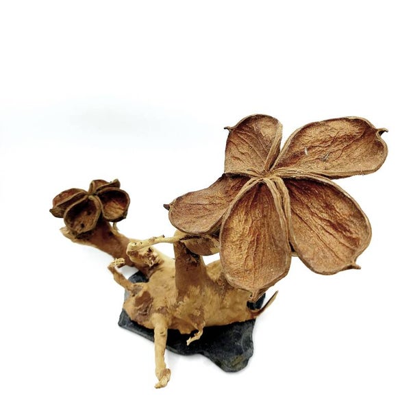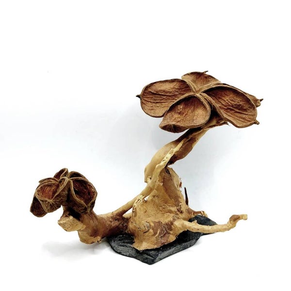 Der "Blütenbaum" besteht aus Wurzelholz (Spiderwood/ Moorkien/ Fingerwurzel), das auf einer Schieferplatte angebracht ist. Bei den Blüten handelt es sich um Landlotus.